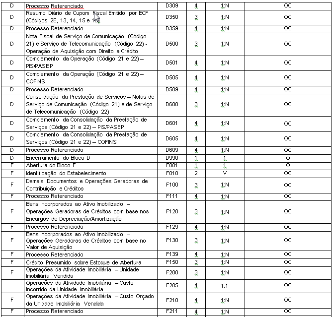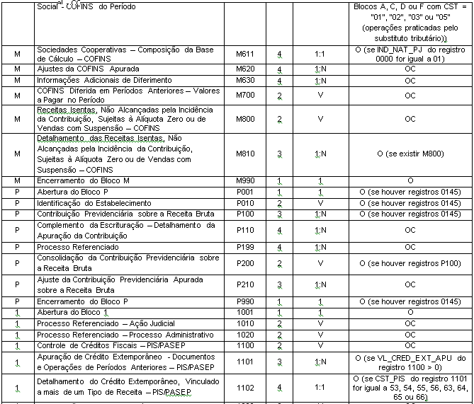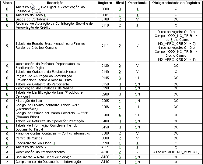 A listagem completa dos registros disponíveis em cada bloco, bem como a ocorrência de cada um deles e seus campos e formatações, podem ser obtidas no que descreve o Anexo Único à Instrução Normativa RFB nº 787, de 19 de novembro de 2007, com a redação data pela Instrução Normativa RFB nº 926, de 11 de março de 2009 disponível em http://www1.receita.fazenda.gov.br/sistemas/efd-contribuicoes/default.htm.