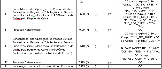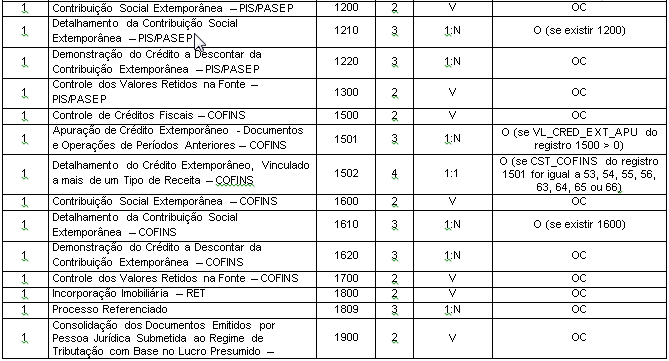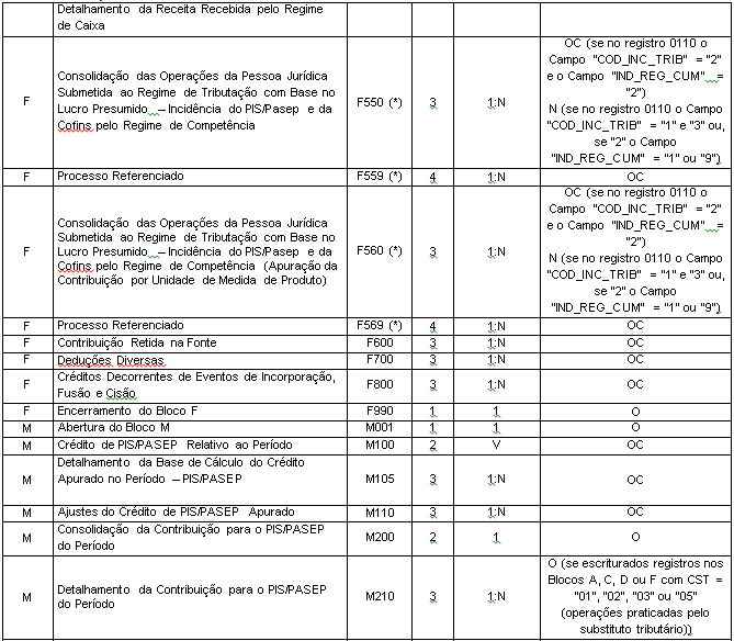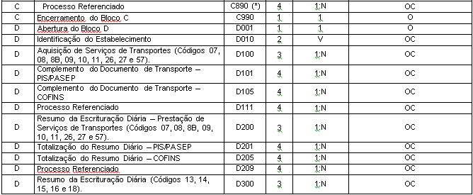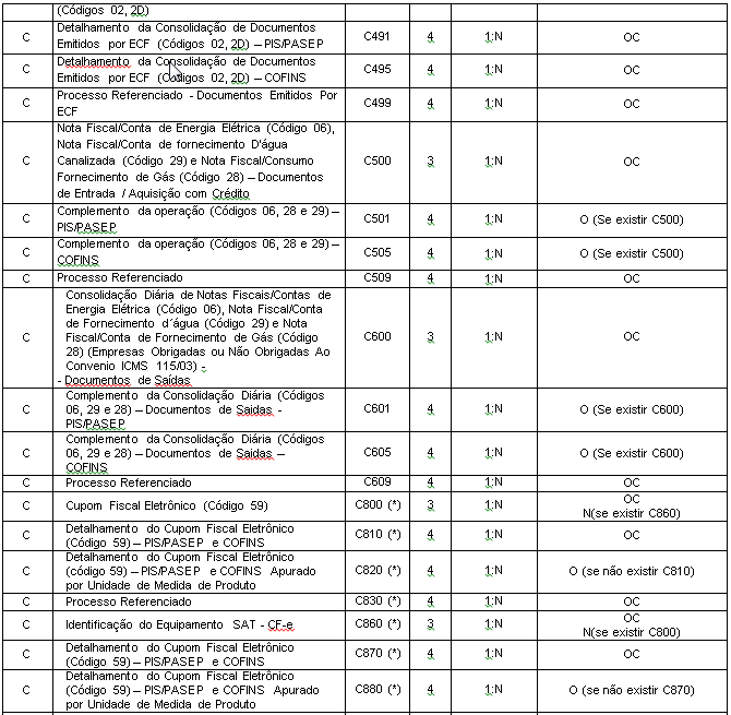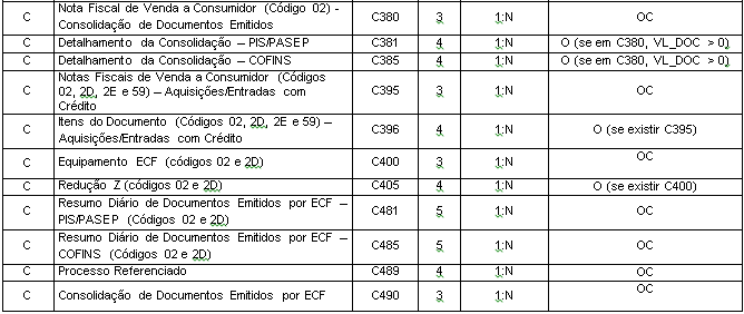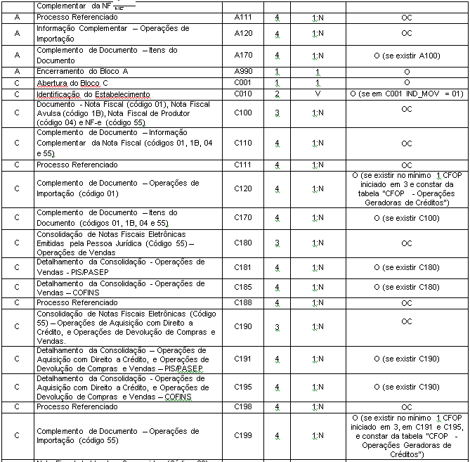 • OC = O registro é obrigatório, se houver informação a ser prestada. Ex. Registro C100 – só deverá ser apresentado se houver movimentação ou operações utilizando os documentos de códigos 01, 1B, 04 ou 55.