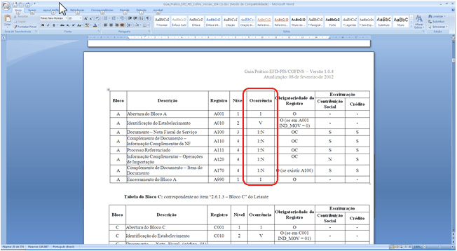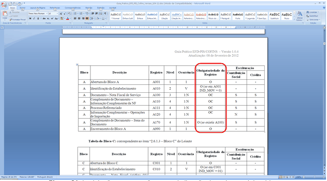 Todos os registros obrigatórios de serem informados possuem a indicação “Obrigatoriedade do Registro” contido no Anexo Único, como pode ser visto na Figura 01, que apresenta o a relação de Blocos e Registro conforme consta na legislação.