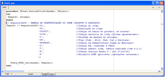 As funções de RegistroXXXX, são as funções principais da dll onde “XXXX” representa o registro a ser gerado. Elas recebem os parâmetros necessários para a criação do registro, retornando uma Integer que informa a correta geração do registro solicitado ou a presença de erros no processo. A Figura04, retirada do Demo do produto, apresenta os valores em formato de string enviados para a DLL e que simula a passagem das strings vindas do banco de dados, ou seja, é informando cada parâmetro que é o campo respectivo do banco de dados.