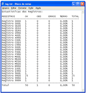 Os logs de geração listam os possíveis erros encontrados durante a geração do arquivo e as estatísticas dos registros (mostrando a porcentagem de registros gerados, erros e observações encontradas durante a geração do arquivo erro.txt, conforme mostrado na Figura06.
