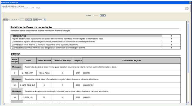 • Log de erros de geração de registros automático e completo contendo inúmeras informações pertinentes a respeito do processo de geração e dos problemas detectados;
