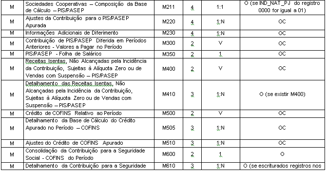 A legislação do EFD-Contribuições indica em uma tabela a obrigatoriedade de cada registro conforme a seguinte sistemática: