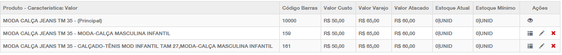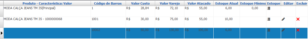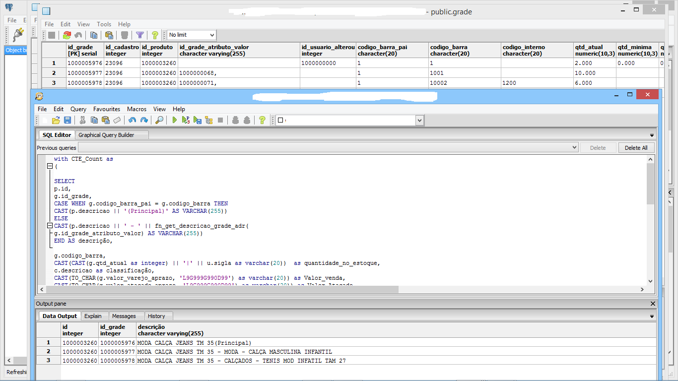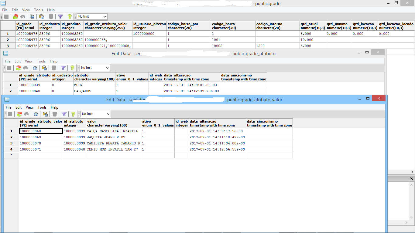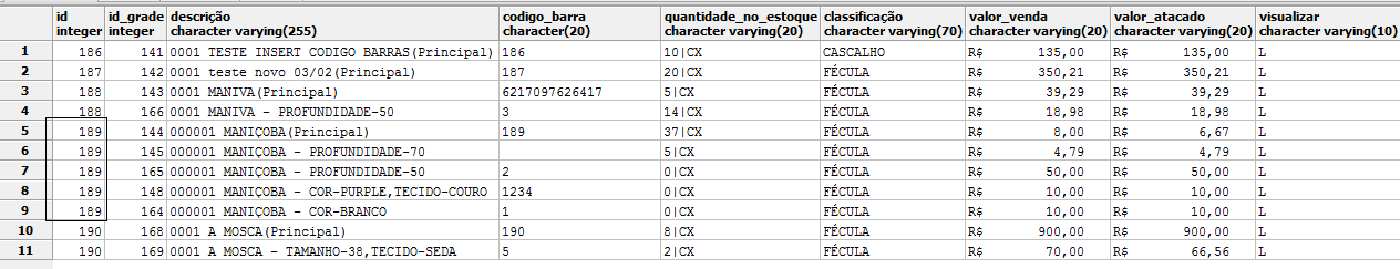 já na linha 3 da grid que tenho dois id_grade_atributo_valor não esta retornando nada na célula NOME DO PRODUTO da grade.