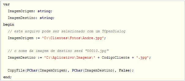 Simples! Durante a cópia, você pode renomear o arquivo conforme algum dado que identifique o cliente, como o próprio código. Por exemplo, no cadastro do cliente nº 10, o usuário irá carregar o arquivo “Andre.jpg” na aplicação, mas este arquivo será salvo como “00010.jpg” dentro da pasta de imagens. Bom, então já deu pra perceber que pra fazer a leitura será bem fácil, não é? Basta carregar a imagem que tenha o nome igual ao código do cliente selecionado.