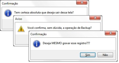 As mensagens acima são irônicas, mas na realidade alguns sistemas parecem fazer uma entrevista com o usuário: para qualquer operação existe uma tela de confirmação, até para as operações mais rotineiras. Mensagens são necessárias sim, mas não em excesso. Há operações que são óbvias, e não precisam ter uma mensagem de informação ou confirmação para serem realizadas. É claro que isso não irá afetar o desempenho do software, mas já me deparei com muitos usuários que solicitaram a remoção de algumas mensagens pelo motivo de atrapalhar a usabilidade.